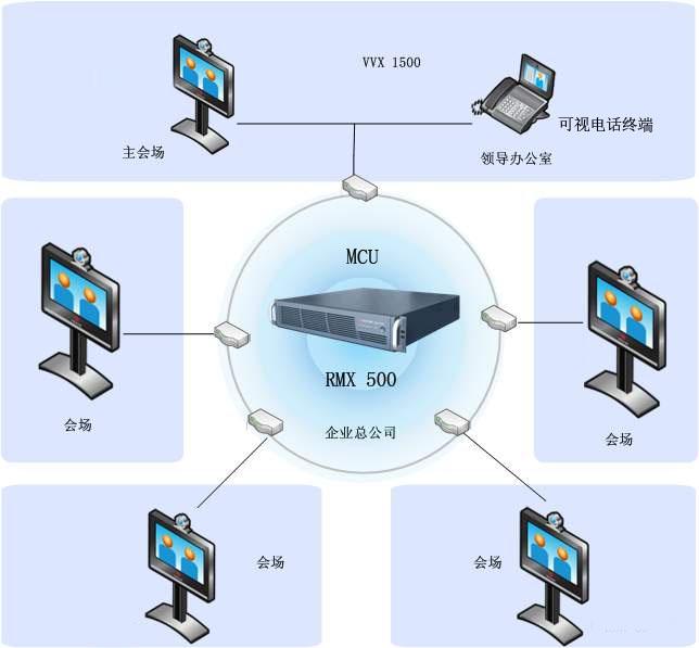 总部主会场作为整个企业的管理核心,总部采用一台多点MCU和1台高清视频会议终端,支持会场会议内容和报表资料分屏进行同时显示,不低于720P高清图像质量,进行远端,近端会场同时显示,达到视觉效果,提高会议的效率领导办公室采用一台可视电话终端,可同时接入会议。