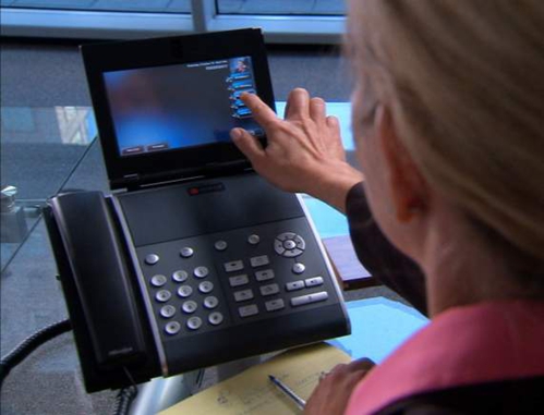 领导通过桌面一体式触摸可视电话随时加入会议,进行会议监控,会议浏览,同时进行会议的讨论。可提供22KHZ的高清语音,内置7” 彩色触摸液晶屏和角度可调的摄像头,一触式快速拨号,在线状态