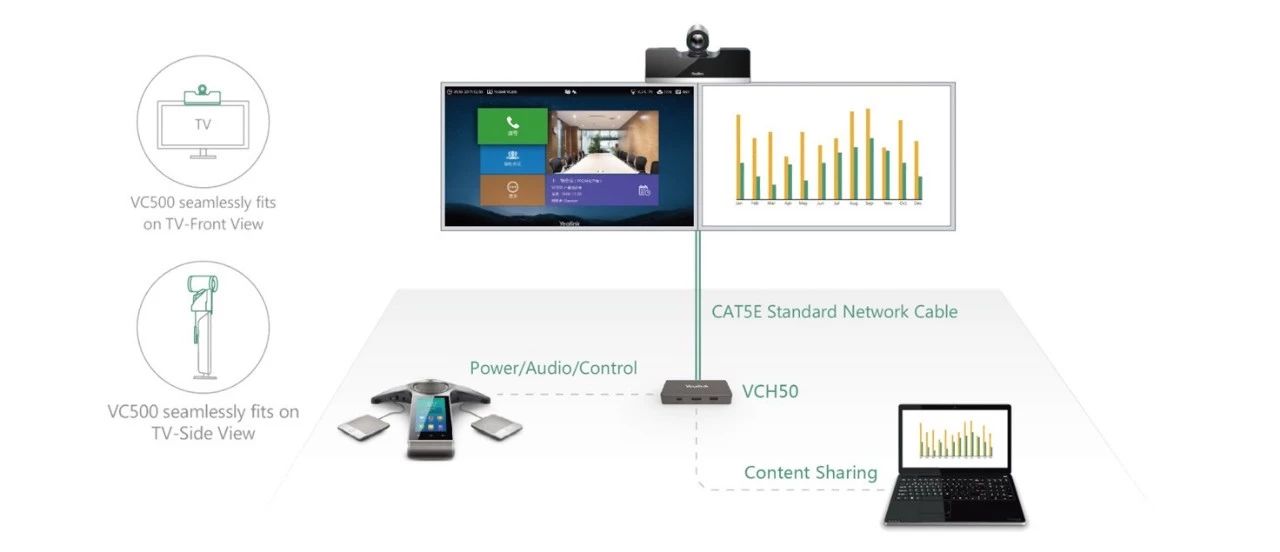 中小型会议室通常会因为设备部署、布线而烦恼,各类设备往往通过复杂的线材相连,不仅不美观还十分麻烦。亿联VC500智能云视讯终端,主机与摄像机一体化设计,可直挂电视,易安装易部署。