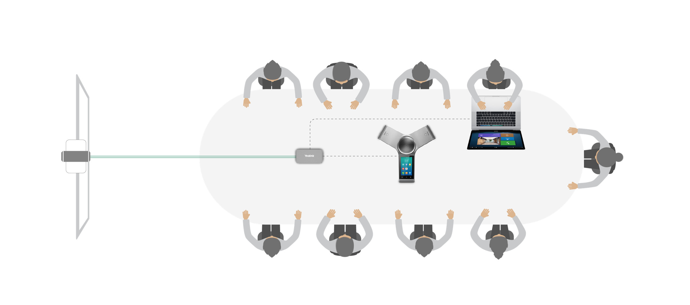 同时,我们标配多功能挂架,可零缝隙贴合于1mm-77mm厚度电视机上,即插即用,安装简单。还有,你只需一根标准网线即可连接电视区与会议桌,现有普通会议室轻松升级为视频会议室,部署起来非常简单。