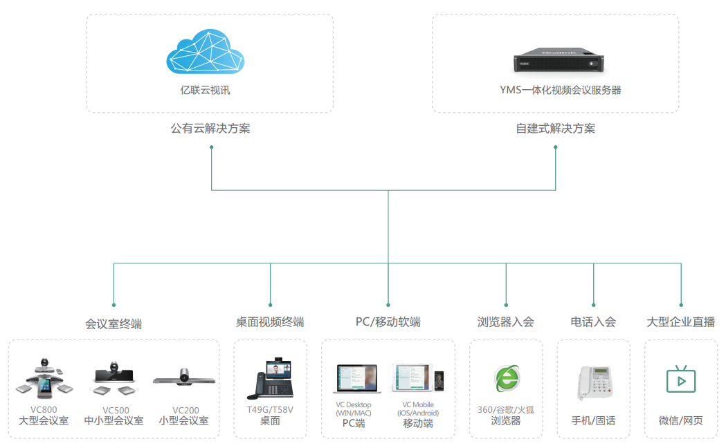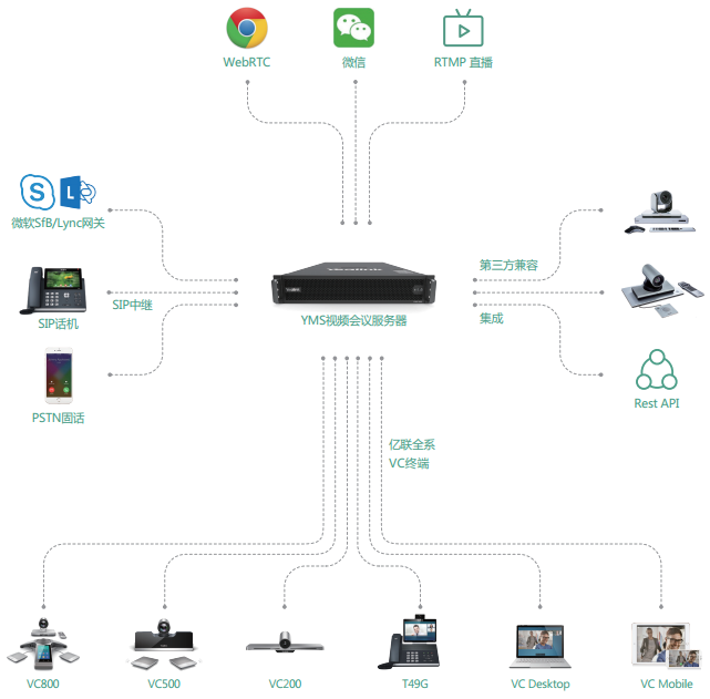 背景分析大型集团组织结构庞大复杂,分支机构地域分布广泛,那么大型集团视频会议系统如何部署?如何加强内部沟通效率,使集团运转更加高效流畅,一直都是个重要课题。传统视频会议系统缺少对部署和管理上的关注,这也是亿联方案的核心优势所在。中小企业场景应用和需求特点1、有大容量会议需求。大型集团机构地域分布广泛,职能分工明确,无论是例会还是业务讨论,都有频繁8点以上视频会议需求2、多种会议形式,需要灵活创建管理。大型集团视频会议种类多,需要多种会议模式与之匹配,例如例会模式、临时会议模式、培训会议模式、领导宣讲会议模式等等3、安全性要求。大型集团会议涉及巨大的商业利益和机密,对安全和稳定尤为重视亿联创造的价值• 性能优良:单机支持80方视频会议,支持级联,满足大型集团大容量会需 • 一体化:集成了MCU、注册、穿透、会议管理、设备管理、企业地址簿、SIP中继、WebRTC、GK和H.460多个服务器于一体,节约成本,方便部署• 会议模式灵活,支持例行会议/临时会议/培训会议/领导宣导会议,不限分组会议数量。• 简单易上手,轻松开启视频会议,服务端与终端无缝配合,简单易用,一键创会,一键入会• 安全可靠,支持双机热备,信令+媒体流+管理操作全加密• 场景覆盖,随时随地接入会议。与Yealink VC终端深度集成,适配亿联全系视频会议终端,支持会议日程推送、企业地址簿、即时会议和一键入会等功能。用户评价1.亿联方案简单好用,解决了项目中专家、营销中心和工厂的及时沟通问题,保证了新品的顺利上市,桌面端和移动端效果是的。