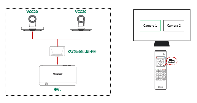 亿联双摄像机方案是有视频会议主机搭配2台UVC84,摄像机会控只要在主机和摄像机之间增加一个摄像机切换器,通过遥控器选择视频输入源,就能对当前视频输入源进行遥控器控制。VCC22是亿联为适配视频会议终端而推出的新视频会议摄像机,采用12倍光学变焦镜头,支持1080P/60帧全高清视频,带云台功能,支持PTZ控制,具有的视频画质及环境适应性。