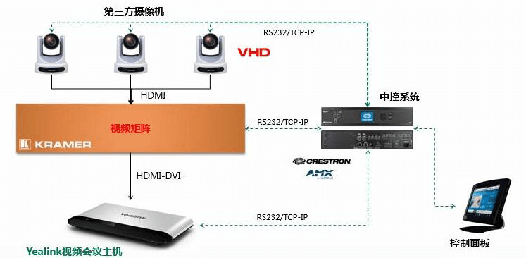 如何将亿联的视频会议主机与第三方多摄像机方案融合,如上图,主机与视频矩阵通过HDMI-DVI线对接,视频矩阵传输到主机的只有视频信号,通用接口标准。第三方标准摄像机通过HDMI线连接视频矩阵。摄像机传输到矩阵的也只有视频信号。在这个方案中,亿联的VCC20摄像机由于供电问题无法接入,所以缺少控制。接入中控系统可以解决该问题。亿联已有现成的API接口可以提供中控系统接入,实现拨号、静音、音量调整等功能控制。此外,如果客户没有中控系统接入计划,也可以定制遥控器映射——网页配置功能,或者客户可以选择使用VCP41进行通话会控。