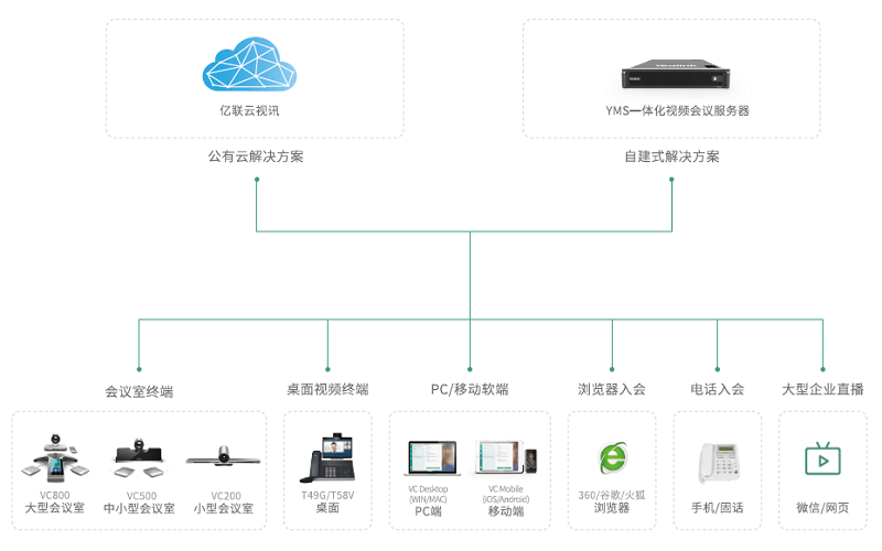 l 自建式(私有云)视频会议服务器:服务商帮忙搭建服务器,适用于大型会场分布。
