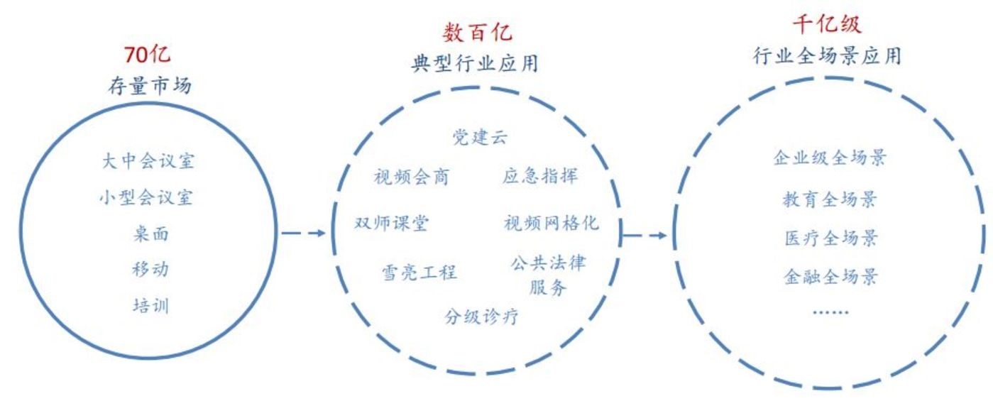 国内云视频会议正处于快速增长垂直行业阶段。云视频应用场景拓宽,垂直深入各行业拉升需求。70亿存量市场覆盖大中会议室,小型会议室,桌面,移动与远程培训。数百亿典型行业应用如党建,教育,应急指挥,公共服务等。千亿级行业全场景应用如企业集团级别全场景,教育全场景,医疗全场景,金融全场景等。云视频技术使视频通信能够从会议室扩展到个人,覆盖更广,可用性更强,成为视频通信业务拓广的强劲助推力。