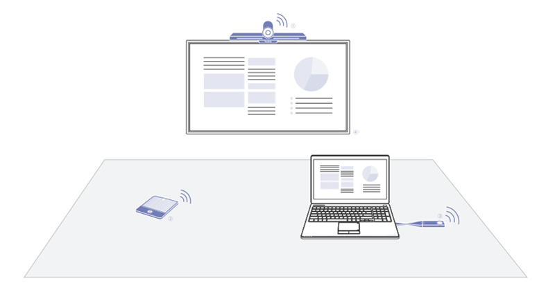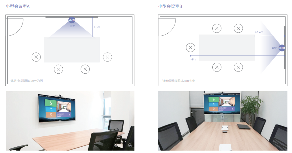该方案适用于空间较为局限的小型会议室,可落座2-6人,智能云视讯VC200适用于该类场景,103°的广视角能够在紧凑在空间内能将所有参会者纳入画面。VC200内置麦克风可有效拾取人声,搭配无线投屏器WPP20实现无线化部署,再选配无线拓展麦克风,可保有效拾取所有参会人的声音。