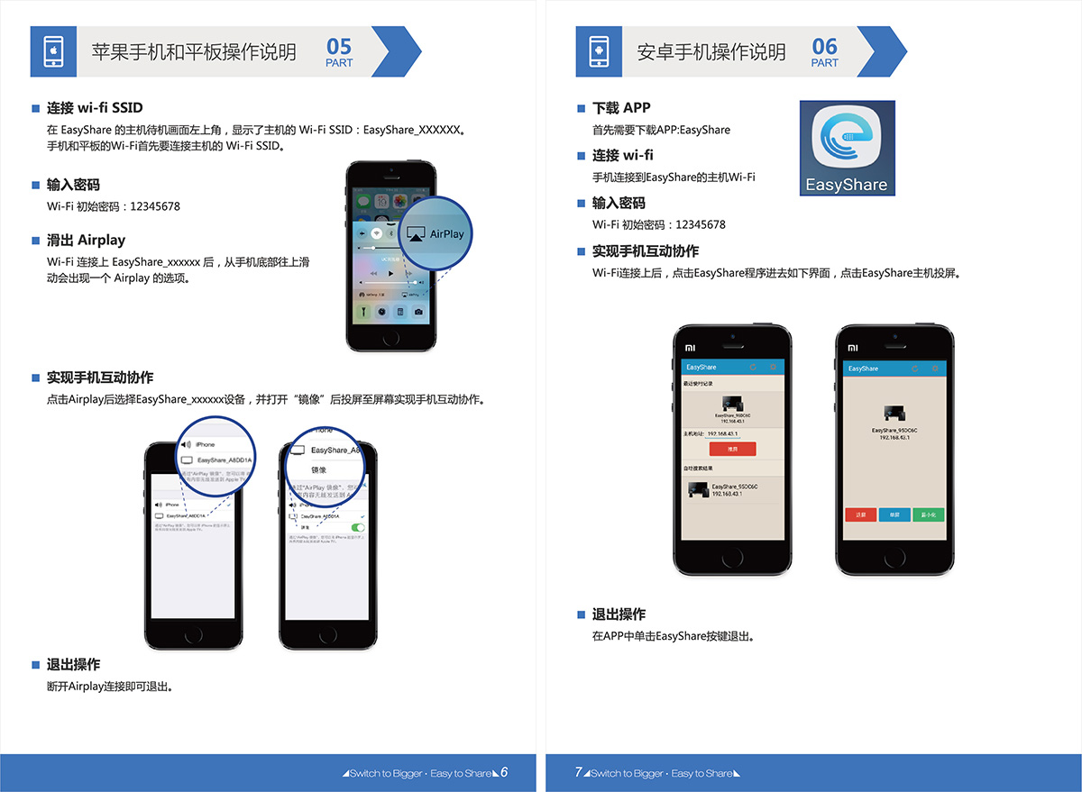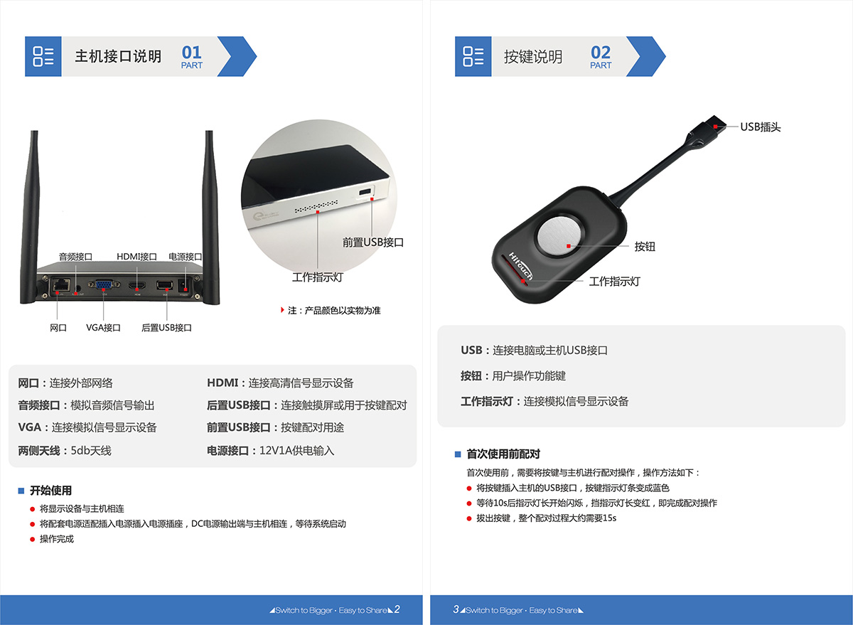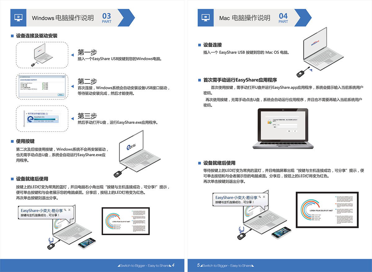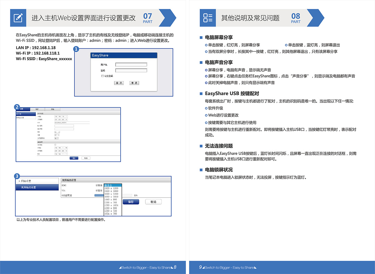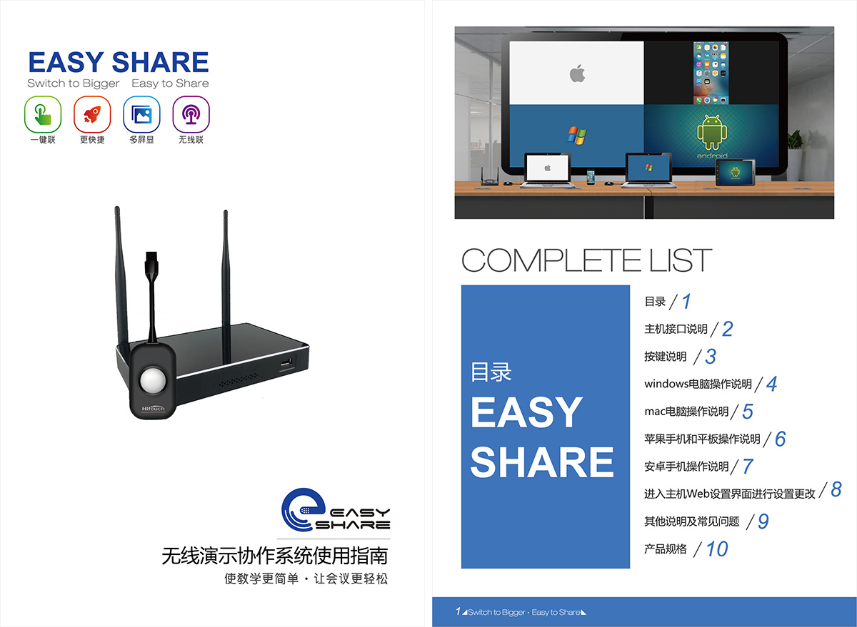 1.EasyShare 无线演示系统支持PC和移动设备同时投屏演示,支持按键切换四画面,无需通过软件选择方式切换;