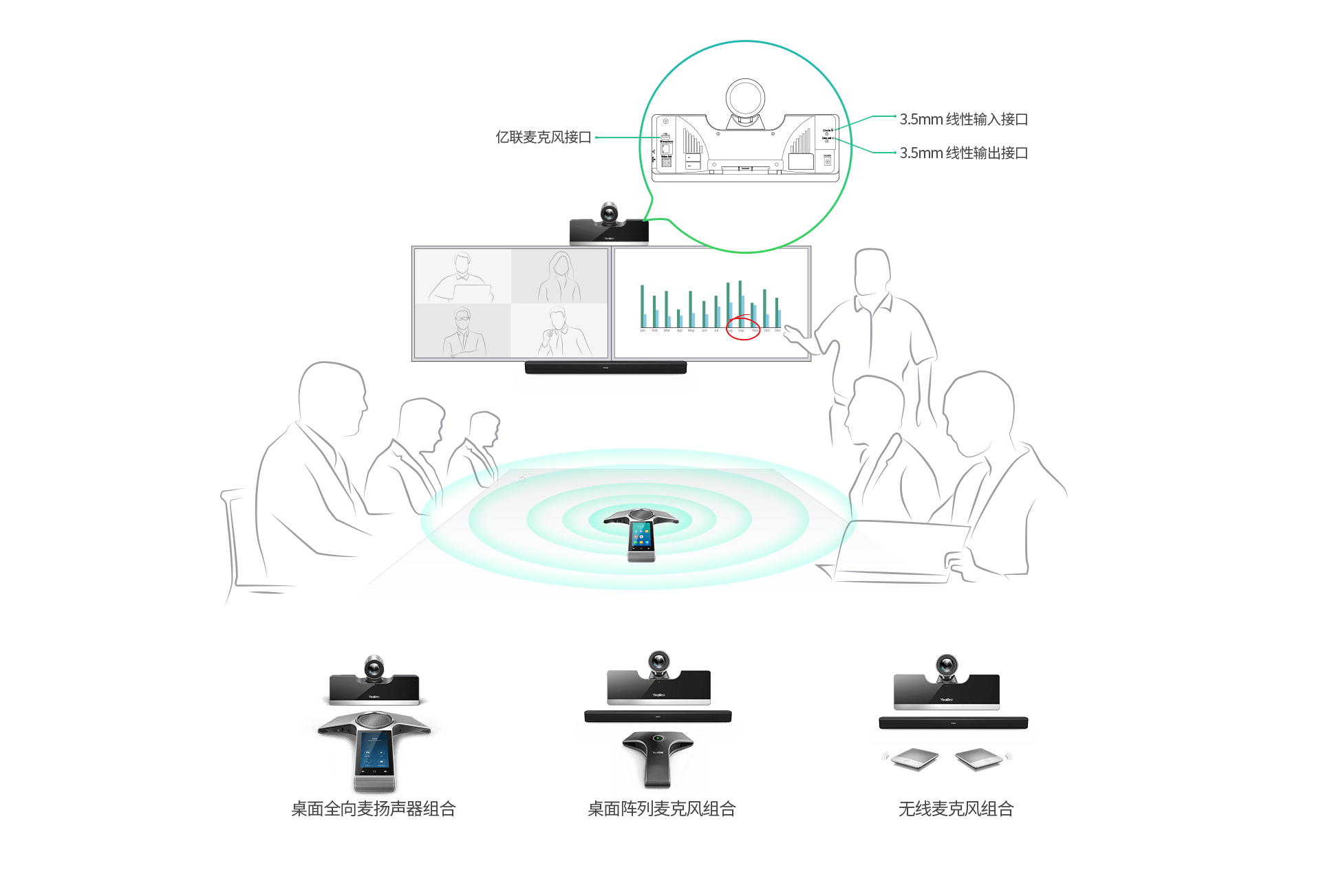 UVC50内置音频模块与接口,能够根据实际场景搭配亿联CP960会议电话、有线/无线麦克风及MSpeaker条形音箱使用,满足用户多样的会议室音频需求。