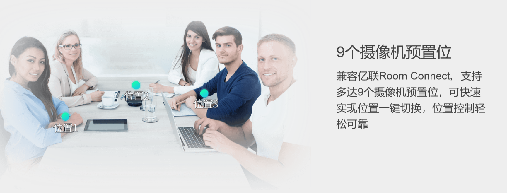 人脸检测与智能取景功能,根据参会人位置自动调整画面大小,免去手动调节摄像机操作.