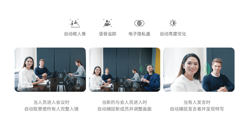 集人体检测、声源定位、语音追踪等多项AI技术于一身,可根据参会人员变化自动取景呈现全员画面,