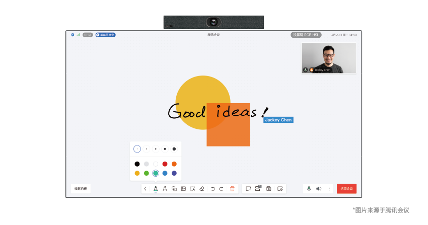 A20内置腾讯会议Rooms支持离线、会中白板功能,可同时展开12块白板互动批注(需配备触摸屏实现)。可支持上传图片白板批注,团队共同灵感碰撞,让会议共创随心。