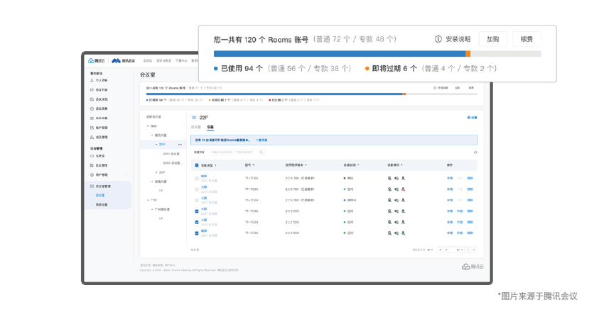 运用集中式后台,企业所有腾讯会议Room设备可进行远程集中化管理,如使用数据、设备运用、软件升级等,节约管控成本,提升运维效率。