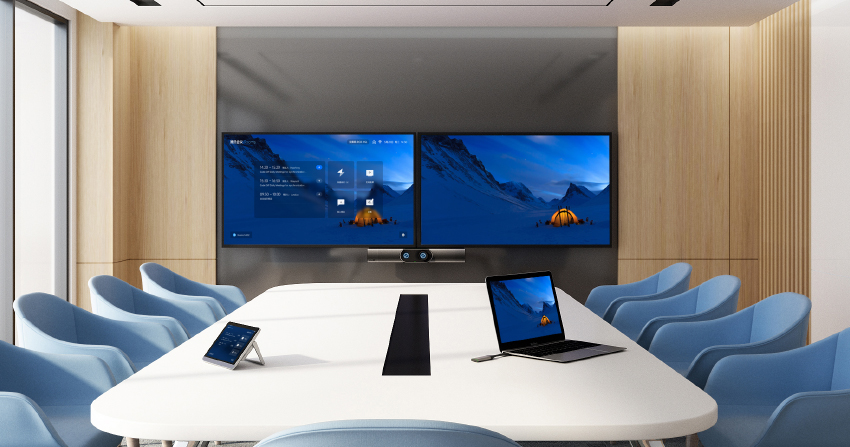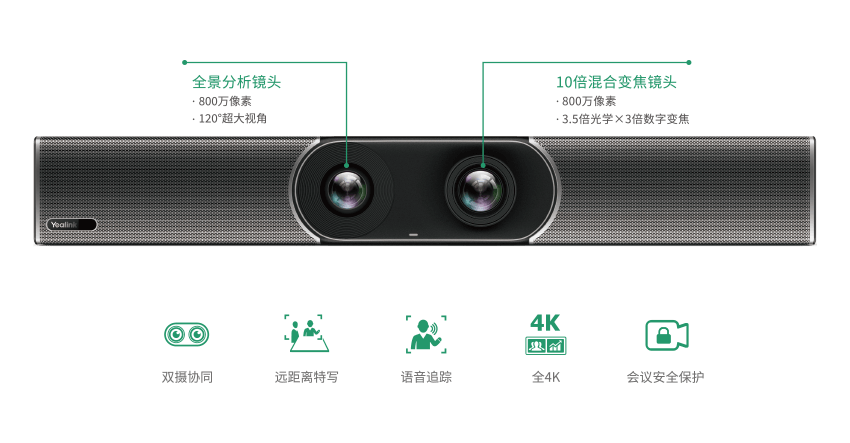 集人脸检测、声源定位、语音追踪等多项AI技术于一身,可根据参会人员变化自动取景呈现全员画面,且实时语音追踪导播,自动特写发言人。 双摄像头协同配合取景更迅速,画质更清晰,助力会议高效进行。