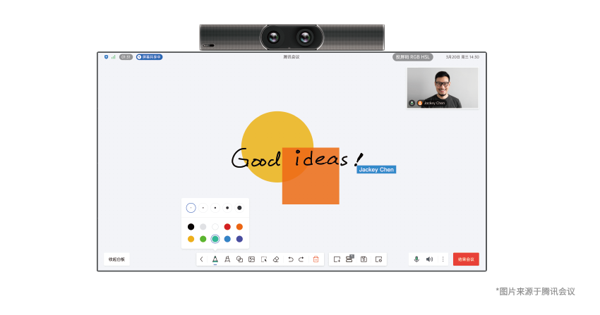 A20内置腾讯会议Rooms支持离线、会中白板功能,可同时展开12块白板互动批注(需配备触摸屏实现)。可支持上传图片白板批注,团队共同灵感碰撞,让会议共创随心