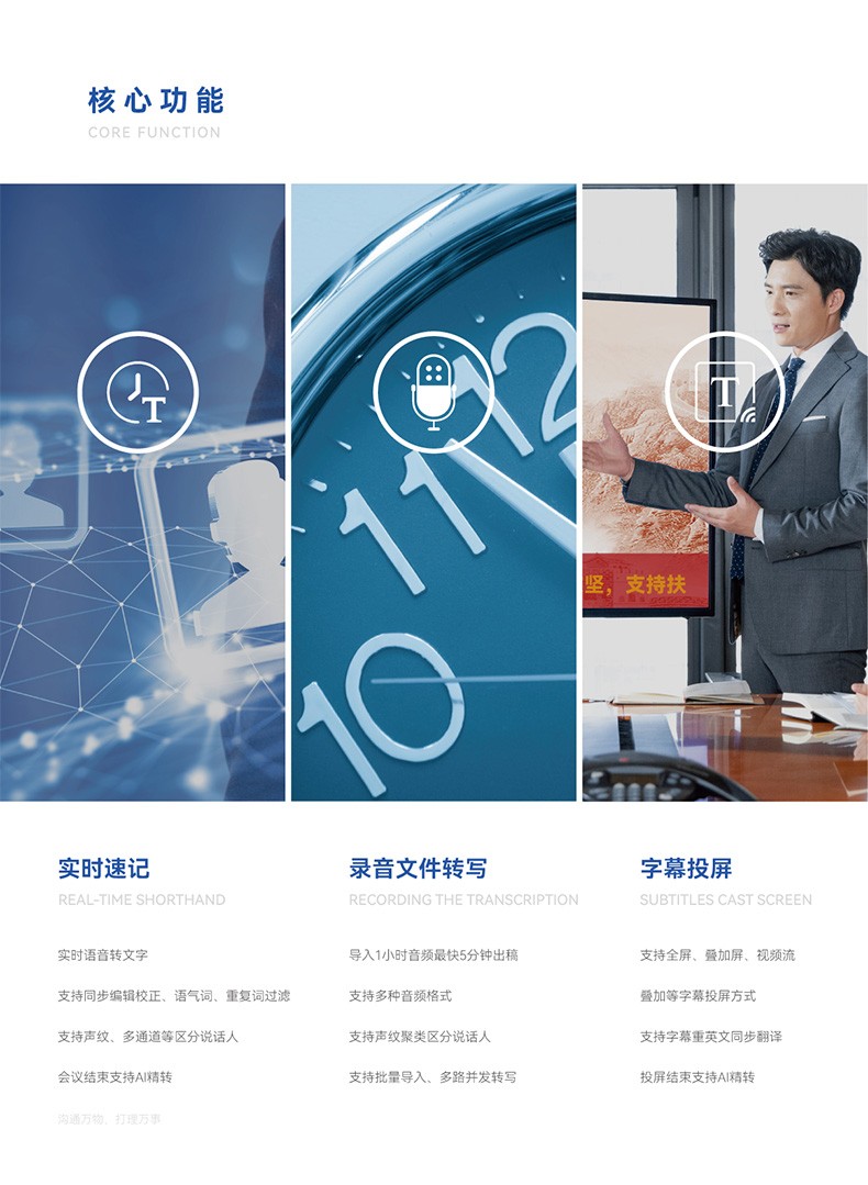 支持语气词过滤,会议模板,记录分享,自动分段,文字导出等功能