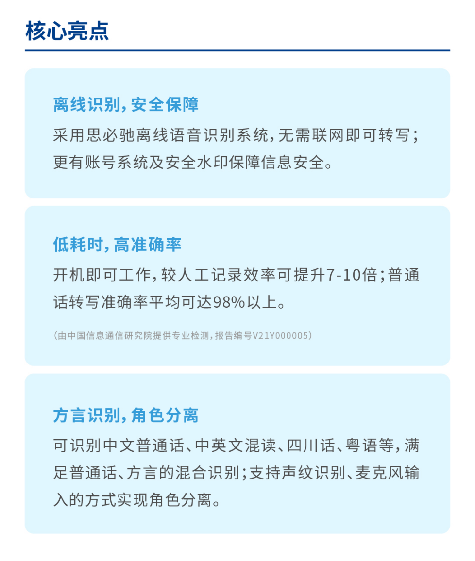 数据安全,可实时语音转写,安静环境下的标准普通话转写正确率达到95%。