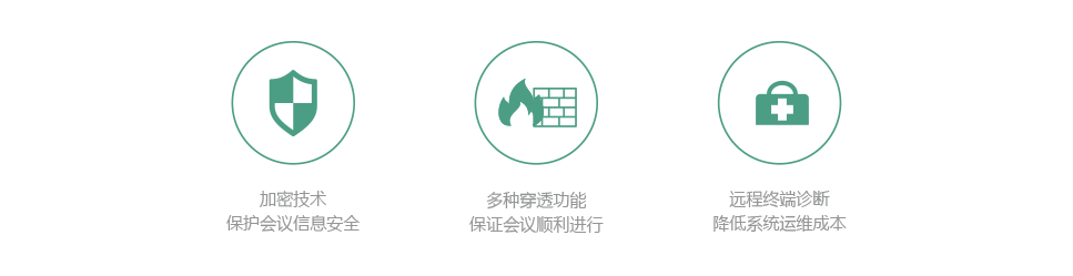 支持TLS/SRTP/HTTPS/SSH等多种加密技术与ICE/TURN/STUN/NAT等多种穿透功能,会议系统安全可靠; WEB界面管理后台,方便IT人员进行系统管理维护、会议统计与分析; 支持远程终端管理,可实现终端设备统一自动升级及远程诊断,降低终端设备维护成本