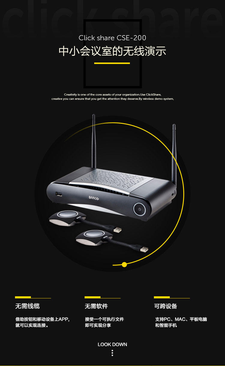CSE‑200为小型和中型会议室提供ClickShare体验。任何人,包括访客,都可以通过单击操作进行连接和分享,无需任何培训。用户只需将一个USB供电的装置(ClickShare Button)插入自己的PC或MAC,然后单击按钮,即可将他们笔记本电脑上的内容显示在会议室大屏幕上。使用ClickShare App,用户还可以分享智能手机或平板电脑上的内容。
