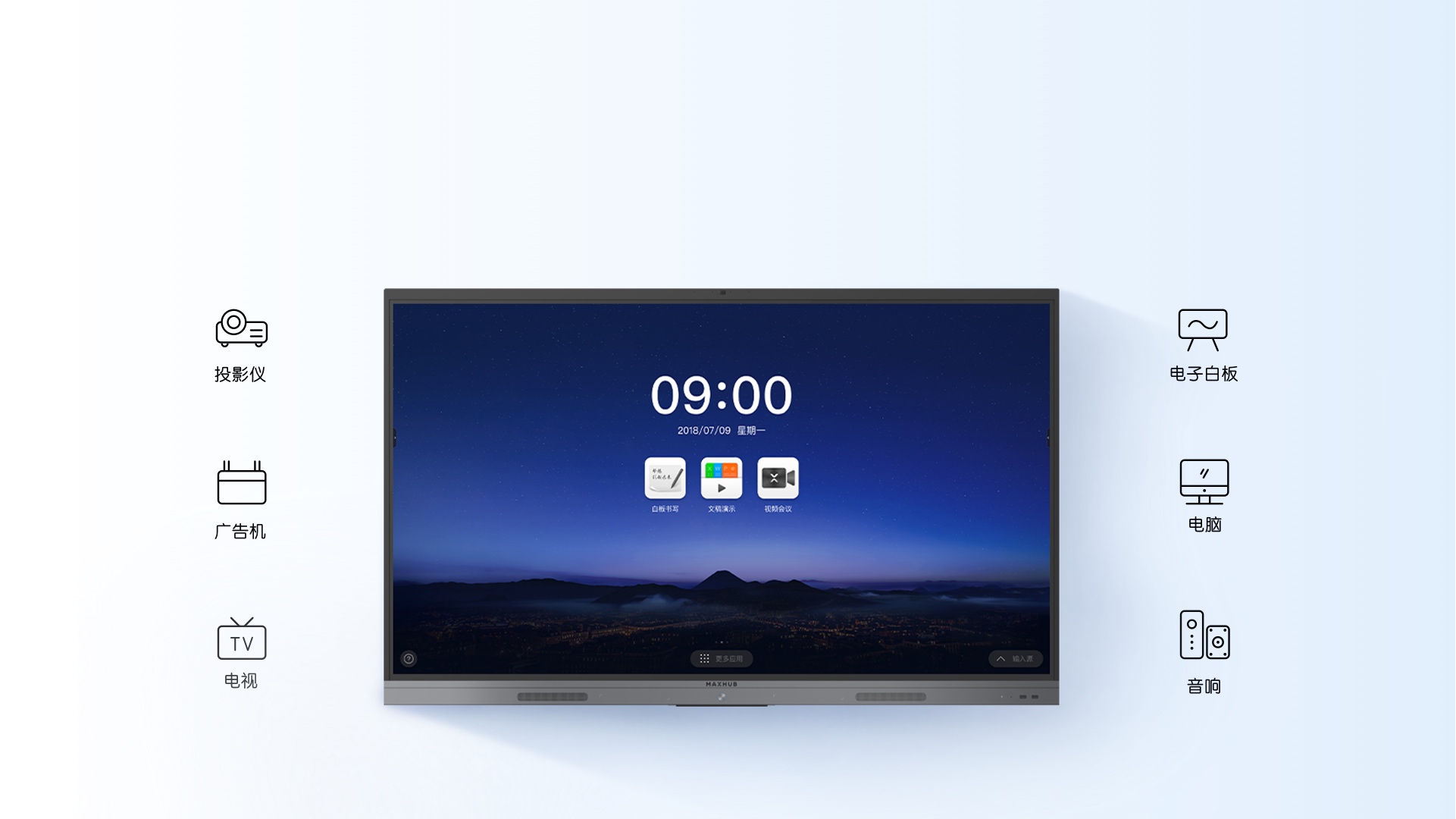 MAXHUB V5 新锐版会议平板集投影、幕布、电子白板、广告机、电脑、麦克风、音响等产品功能于一体,满足