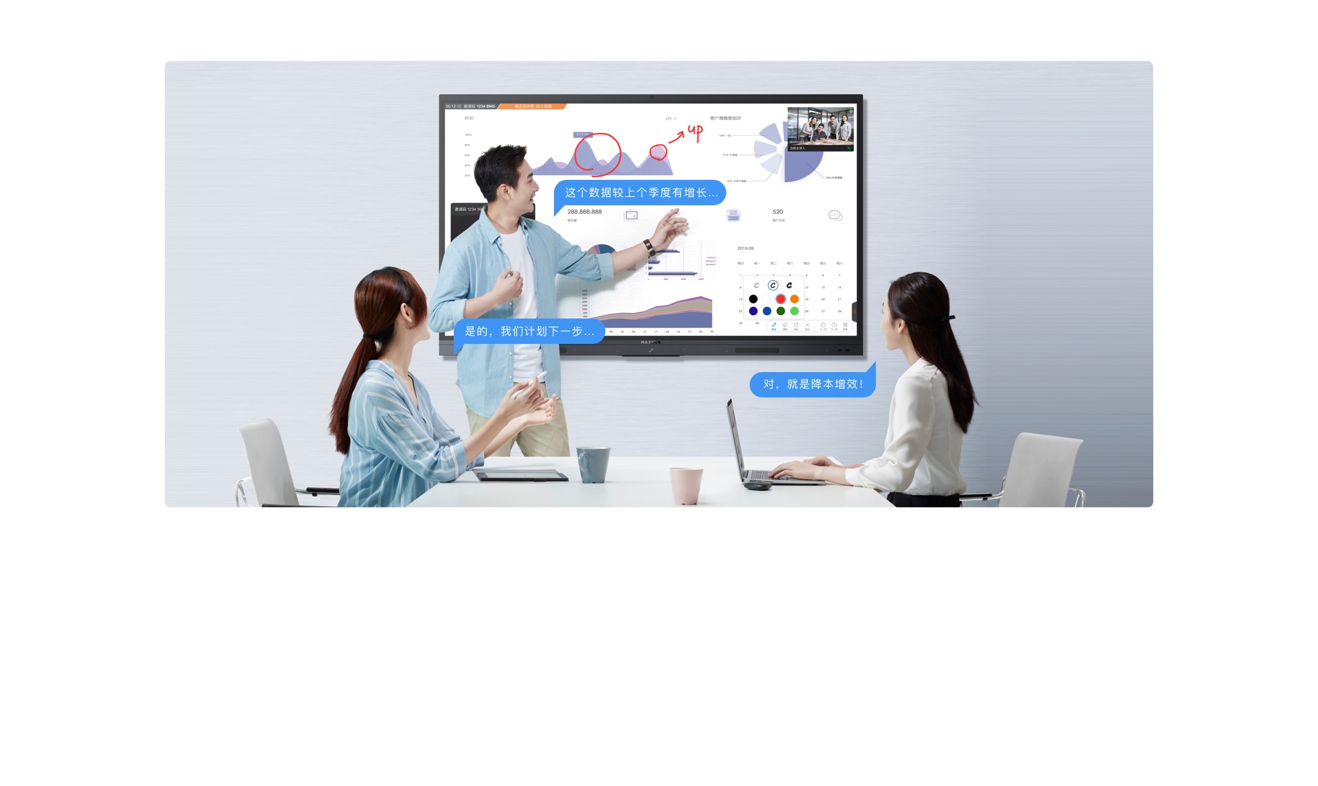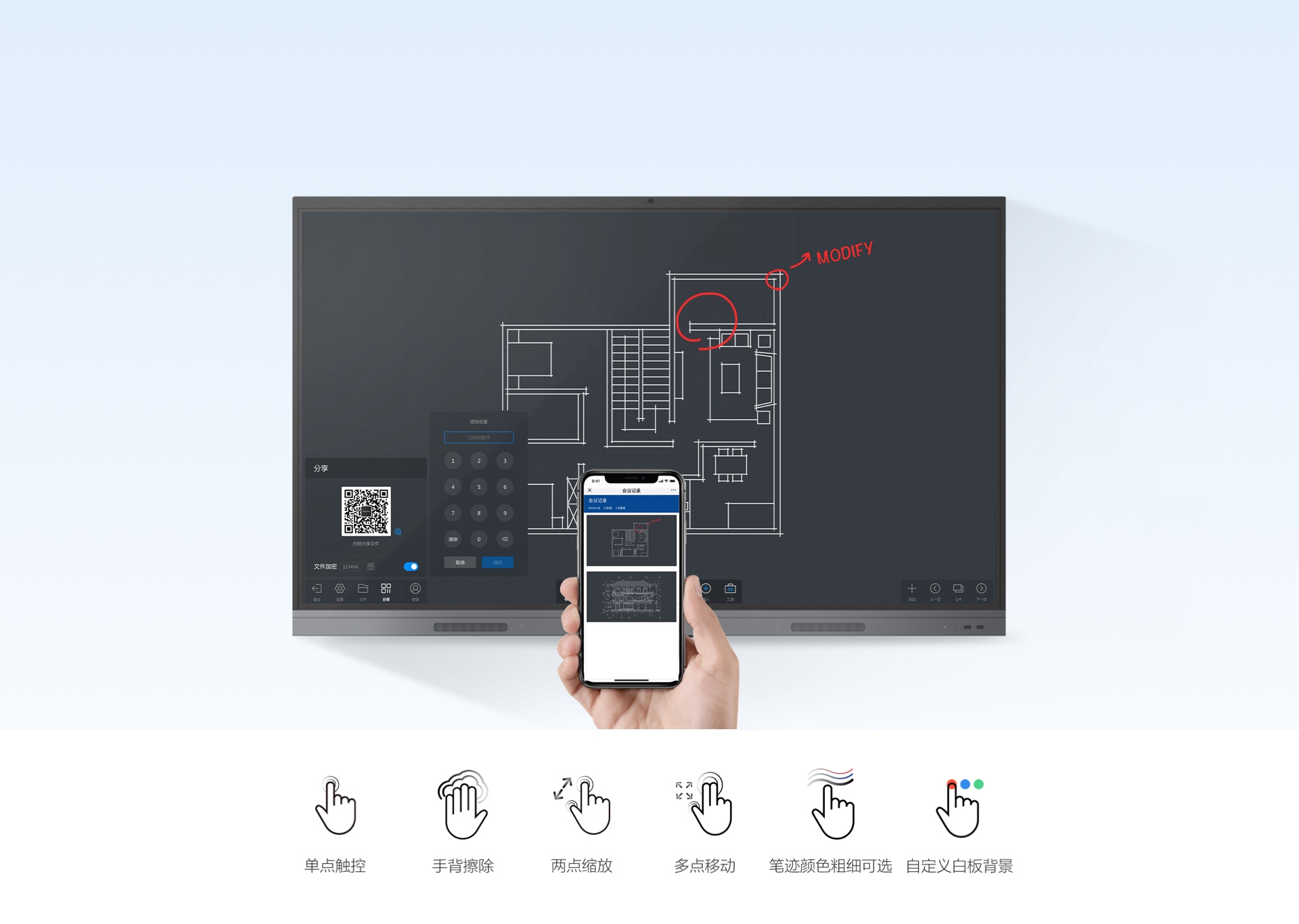 MAXHUB 内置智能白板软件,触控书写搭配便捷手势操作,让想法畅然落笔;打破传统空间限制,书写界面无限